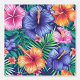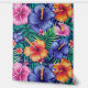 A bold, maximalist tropical floral print with big purple, orange, and pink blooms on a dark blue background,