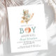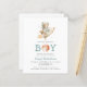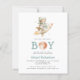 This cute baby shower invitation features a watercolor teddy bear astronaut riding a rocket ship above the words "Houston we have a BOY," with a watercolor planet replacing the "O" in "BOY." Personalize the text with the name of the mom-to-be in blue-green and the details in charcoal gray sans serif font.