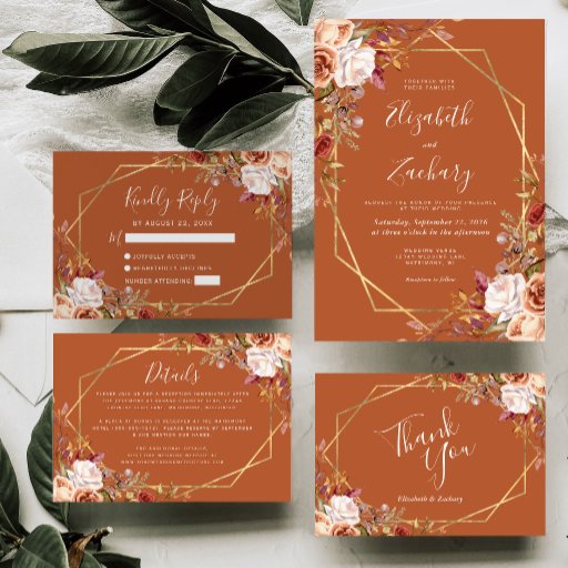 reception dinnerbudget table settingwedding menumodern handwritten calligraphywatercolor floral botanicalgold geometric frameburnt orange rust peach blushburgundy maroon wine red marsalafall autumn wedding