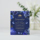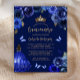 This lovely quinceañera invitation features a border of royal blue roses on a dark blue background. A gold tiara, a dark-haired girl in a royal blue princess dress and small blue butterflies decorate the text. The word "Quinceañera" and the name of the guest of honor appear in elegant gold-colored handwriting script, with the remaining text in sans serif font.