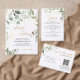 Design feature greenery eucalyptus watercolor with floral gold glitter elements. Using elegant calligraphy font in gold color for the name of the bride and groom that makes it stand-out. It also features couple photo at the back with elegant script monogram.