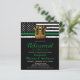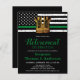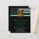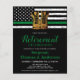 Thin Green Line Military Retirement Invitations. Celebrate years of dedicated service, your military retirement and invite friends and family to your military party with this rustic Thin Green Line Flag with Gold Army Boots Military Retirement Invitation. USA American flag design in Police Flag colors, worn black green white and gold design. This military retirement invitation is also perfect for military graduation, soldier going away part, deployments and homecoming, change venue in personalization. See our collection for matching military retirement gifts, military retirement party favors, and supplies. COPYRIGHT © 2021 Judy Burrows, Black Dog Art - All Rights Reserved. Military Thin Green Line Flag Retirement Party Invitation