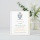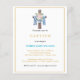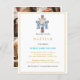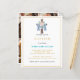 Modern floral roses with blue cloth filled wooden cross in the front with details of the invitation below.