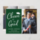 バジェットモダンフォトフレンドリーグリーン卒業発表カード。正面には卒業生の写真と「卒業生への応援」が書白い台本でモダンあり、上にグラッドキャップが付いている。名前と学校で簡単にパーソナライズし、背面に別の写真を追加。