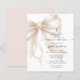 This First Holy Communion invitation features a soft blush beige satin bow made from a pearl rosary, complete with a dangling cross and heart-shaped pearl center detail. The elegant religious design is placed on a clean white background with modern mixed typography, creating a refined and meaningful look for a girl’s communion celebration. Perfect for a Catholic sacrament event, this invitation combines delicate rosary symbolism with graceful script and serif text for a timeless and feminine style. Personalize the wording with your child’s name, date, time, and event details.
