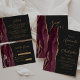 このシックモダンウェディングRSVPカードは、石板の黒い背景に縁ど金ゴールドのグリッターでトリミングされたバーガンディな赤い水の色のアゲートを備えているフェイク。文字は金ゴールド色の書道の台本とモダンサンセリフのフォントで、ゲストの名前と応答の宇宙を持つ。裏面は、一致するブルゴーニュと金ゴールドアガートデザインを備える。
