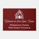 This professional realtor doormat is custom made with your real estate company name under the modern welcome in white cursive script for an open house. This chic custom burgundy realty business decor features a house logo image for home builder or realty agent company marketing.