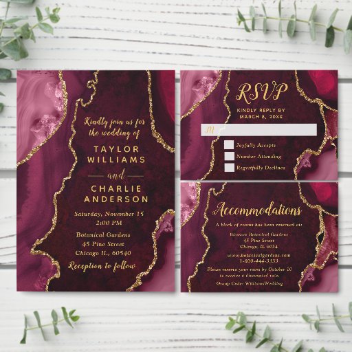 Burgundy Red and Gold Agate Wedding Accommodations エンクロージャーカード