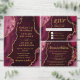 Provide your guests with important travel details using this wedding accommodations enclosure featuring a burgundy red agate marble design accented with gold details. The bold geode-inspired background creates a sophisticated look, perfect for fall and winter weddings, formal celebrations, or evening events. Designed to coordinate with your wedding stationery suite, this piece is ideal for sharing hotel blocks, booking information, and travel arrangements in a clear format. The clean typography ensures readability while complementing the agate texture. Easily personalize all text to suit your wedding details and create a seamless, polished experience for your guests.