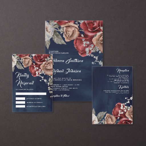 Burgundy Red Floral QR Code RSVP Navy Blue Wedding エンクロージャーカード (この独立クリエイターのコレクションをカスタマイズ。)Burgundy Red Floral QR Code RSVP Navy Blue Wedding エンクロージャーカード (裏面)Burgundy Red Floral QR Code RSVP Navy Blue Wedding エンクロージャーカード (スタンド正面)