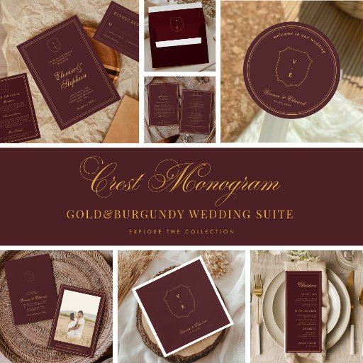 A burgundy wedding welcome letter and itinerary card featuring an elegant gold crest monogram, refined borders, and a classic layout. The rich palette and timeless detailing create a warm, sophisticated introduction to your wedding weekend. Perfect for formal, evening, or fall celebrations, this card provides guests with essential information while adding a polished, coordinated touch to your wedding suite.