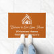 This professional realtor doormat is custom made with your real estate company name under the modern welcome in white cursive script for an open house. This chic custom burnt orange realty business decor features a house logo image for home builder or realty agent company marketing.