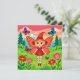 A vibrant and playful 2D cartoon illustration featuring a young fairy with large, red-patterned butterfly wings. The character wears a tall red pointed hat, a matching red dress, and polka-dot tights, floating in a lush green meadow. The scene is filled with oversized colorful flowers and fluttering butterflies, set against a background of evergreen trees and snow-capped mountains under a warm sunset sky.