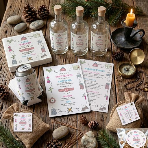 Complete your "Last Trail Before The Veil" setup with these charming camping bachelorette party bottle labels. Designed to match our "Camp Bach" party suite, these labels feature whimsical, hand-drawn outdoorsy icons including tents, backpacks, and campfires. Whether you're hosting a gourmet BBQ at a luxury cabin or roasting s'mores by the lake, these bottle labels add a personalized, professional touch to your party decor and drinks. They are a must-have for any adventure-loving bride’s final fling! Easily update the name, date, and location to fit your specific trip. Perfect for mountain, forest, or national park bachelorette themes. Coordinate your entire event by pairing these with our matching "Camp Bach" party suite!