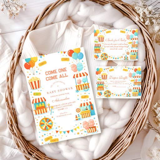This playful circus-inspired design captures the joyful spirit of a classic carnival celebration. Featuring a charming big top tent, colorful balloons, festive bunting, and soft cloud details, the artwork has a warm storybook feel that’s cheerful without being overwhelming. Perfect for a fun and imaginative baby shower with a lighthearted, welcoming vibe.