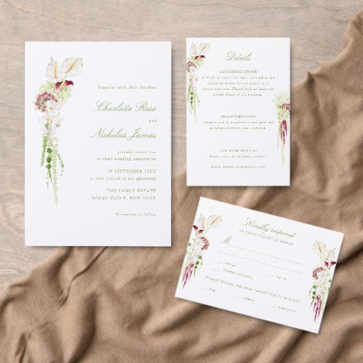 The invitation is adorned with a stunning cascading floral bouquet design, featuring watercolor illustrations of white anthurium and amaranthus flowers. These delicate blooms, rendered in moss green and rich merlot hues, create a harmonious and inviting aesthetic that evokes the natural beauty of a flourishing garden.