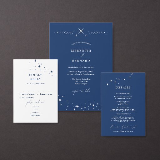 Invite your guests to a night of romance and starlight with this Celestial Elegant Wedding Moon Blue Save The Date from the Celestial Elegant Wedding Collection. Featuring a deep navy blue background adorned with twinkling stars and refined typography, this modern celestial design is perfect for couples who love a minimalist yet luxurious aesthetic. Easily personalize with your names, wedding date, and venue details for a fully customized touch. Ideal for celestial weddings, winter celebrations, or elegant evening receptions. Pair it with matching RSVP cards, programs, menus, and signage for a cohesive wedding suite.