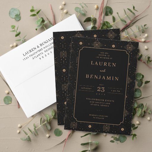 Invite your guests on a journey among the stars with our “Celestial Romance” collection: an elegant and dreamy stationery suite inspired by the night sky, moonlight, and the cosmic magic of your love story. This collection features a celestial romantic style with a cohesive black and gold color palette, evoking sophistication and timeless charm. The designs incorporate intricate star patterns and minimalist typography to create a luxurious yet understated look. Recurring motifs include ornate borders and monograms, tying together various product types such as invitations, napkins, wine labels, address labels, and more. These versatile pieces are perfect for wedding events, ensuring a harmonious and memorable aesthetic throughout.