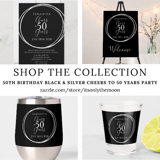 This is a chic and elegant 50th birthday party design. This stylish design is in classic black and silver. It has the message, "Samantha", "Cheers to 50 years" and the celebration date. This modern, typography motif is framed by an elegant silver foil effect circle. This stylish design is perfect for a chic and unforgettable 50th birthday party or celebration and is ideal as a party accessory, tabelware, personalized party favors or birthday gift. To personalize, simply add your name and date in the personalize this text box. To change the color or font, check out the design editing tool. If you need help with personalization, or for a custom design contact me via zazzle chat.