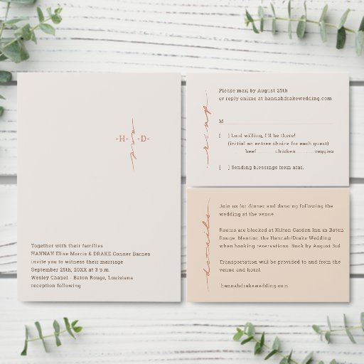 Customizable wedding invitation featuring a modern Christian cross formed from the couple’s initials, joined by a handlettered script “and.” This refined detail creates a meaningful focal point—symbolizing a Christ-centered marriage covenant. The clean, text-forward layout pairs a timeless slab serif font with elegant script accents, set in a warm neutral palette of cocoa brown, terracotta, warm blush, sand, and linen. Script elements are color-customizable, allowing you to tailor the design to your wedding palette while maintaining its signature style. Part of a thoughtfully designed suite, this invitation coordinates with matching enclosures, stationery, and accessories. Select pieces feature the signature cross motif, while others highlight the classic serif and script combination for a cohesive yet varied, elevated wedding collection.