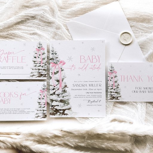 This Christmas Baby Shower invitation features Christmas Ornaments and a neutral bow. The neutral beige theme is perfect for a boy or girl winter Baby Shower. At the backside you can add your own photo of beautiful the mom-to-be.