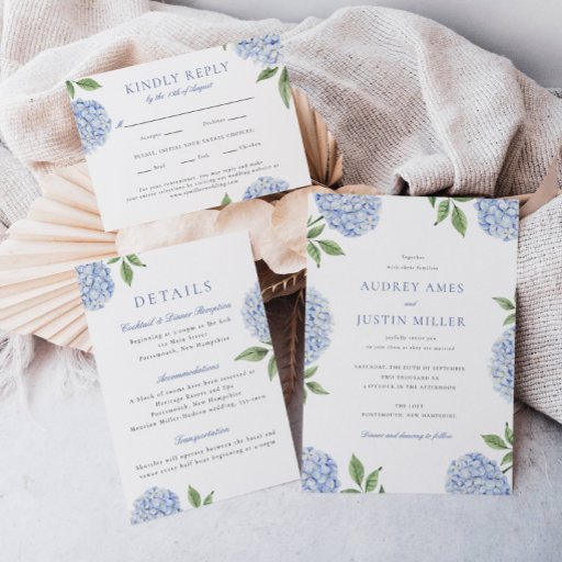 This beautiful design features an all around frame of blue hydrangea blooms and your custom text on the front. Use the template form to add your information.