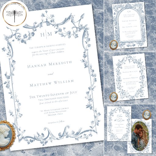 Share your gratitude after your special day with an elegant traditional folded wedding thank you card featuring a detailed, vintage-style engraving border of florals in soft dusty blue. Perfect for a formal ceremony or an affair with a classic, timeless aesthetic. This refined design offers an opulent look. Created by Simply Farmhouse Press.