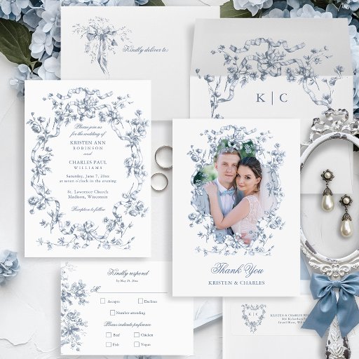 This classic and romantic design is a modern adaptation of an historic French etched frame of dusty blue intertwined roses, flowers, foliage and ribbons ca 1770 by Rococo designer Pierre Ranson. It includes text fields, line elements and a customizable background color on the inside.