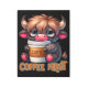 A funny and sarcastic design showcases a cute highland cow holding a to-go coffee cup brimming with coffee. With big blue eyes and a sleepy, tired expression, the cow rests its head on the cup's lid, its fluffy black fur adding to the charm. The colorful text reads, "Coffee first." This playful design is available on a wide variety of products, making perfect gifts for coffee lovers.