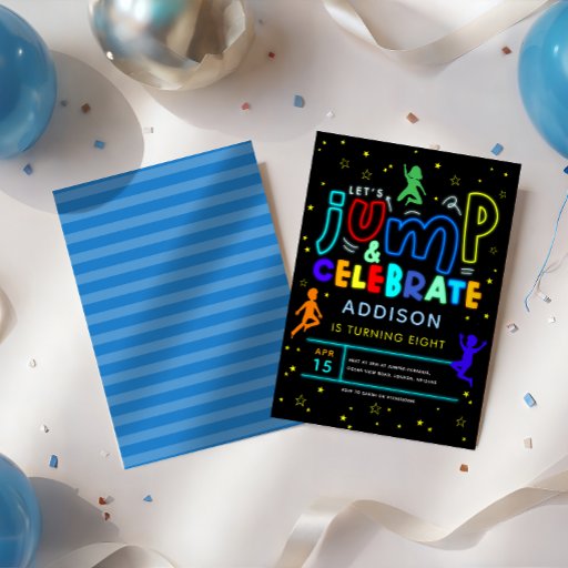 Jump and celebrate with this neon boys’ birthday invitation! Featuring bold text “jump and play,” bouncing silhouettes, and fun and colorful polka dot accents — perfect for a trampoline or jump party. Set as an 9th birthday invite but fully customisable.
