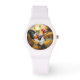 Rise and shine watch featuring a colorful painting of two roosters at sunrise. The numbers are optional.