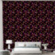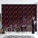 Whimsical red hues and gold stars flecked across a black background