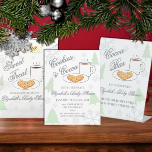 Cookies and cocoa gender neutral baby shower with gray snowflakes and winter green trees bordering a plate of chocolate chip cookies and a mug of hot chocolate