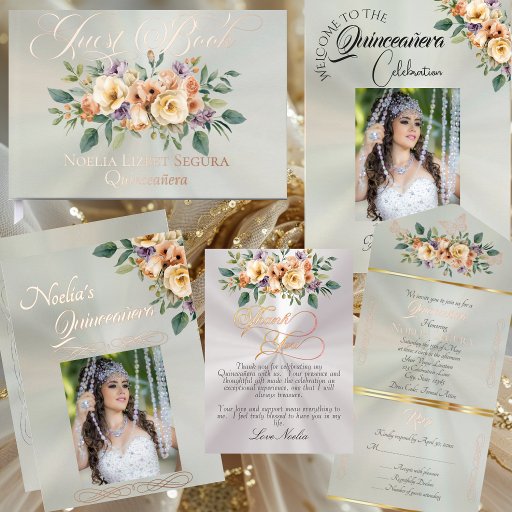 This elegant floral Quinceanera program is ready to personalize with your order of events, special thanks and any other information you wish to add. The design features cream floral bouquet on an elegant pastel background. Designed to coordinate with the "Cream Foral on Pastels" Quinceanera Collection. To change details, click «Personalize». To move the text or change the text size, font, or color click «Click to customize further»