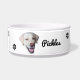 This bowl features a custom pet photo and name with paw prints.