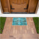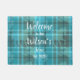 White doormat printed with a teal blue equestrian tartan plais pattern hand drawn by Anne Londez, personalized with your family name and date of establishment. Perfect as a gift for a housewarming party.
