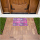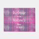 Coir fiber doormat printed with a pink and purple equestrian tartan plais pattern hand drawn by Anne Londez, personalized with your family name and date of establishment. Perfect as a gift for a housewarming party.