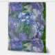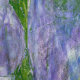 An acrylic abstract painting with the impression of green leaves and purple flowers.