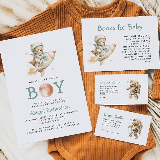 This cute baby shower invitation postcard features a watercolor teddy bear astronaut riding a rocket ship above the words "Houston, we have a BOY," with a watercolor planet replacing the "O" in "BOY." Personalize the text with the name of the mom-to-be in blue-green and the details in charcoal gray sans serif font.