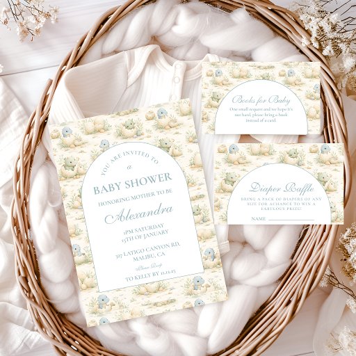 Welcome a little one with this charming storybook-inspired dinosaur design, featuring soft blue illustrations and a delicate vintage nursery feel. The playful dinosaur pattern paired with a clean arched layout creates a gentle and timeless look, perfect for a cozy and joyful baby shower. With its soft color palette and classic storybook aesthetic, this design feels warm, inviting, and effortlessly adorable—ideal for celebrating a baby boy or a whimsical dino-themed event.