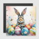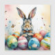 A charming Easter illustration of a cute bunny surrounded by beautifully painted eggs, spring flowers and a butterfly. Soft watercolor tones and playful details create a joyful spring atmosphere celebrating Easter and renewal.