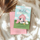Celebrate your girls 2nd birthday with this cute farm animal barnyard invitation featuring a watercolor style pink barn, baby pig, cow, sheep, and chick. Fun and colorful, with “Oink, Baa, Moo – [Name] is turning two!” on the front and classic pink gingham on the back. Perfect for a toddler’s farm birthday party!