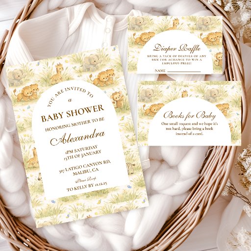 A sweet storybook-style safari design featuring gentle watercolor baby animals including lions, giraffes, and elephants surrounded by soft jungle greenery and delicate botanical details. The warm neutral palette of cream, honey gold, and soft olive creates a timeless nature-inspired aesthetic, while the elegant arched layout leaves beautiful space for personalized event details.