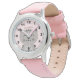 Lindo Diseño de Reloj para niña con ilustracion de un Lindo Gato de color gris sonriendo con un fondo Rosa y el Nombre de tu hija! Si tu hija esta aprendiendo a usar el reloj este puede ser un magnifico regalo. No dude y adquiera este lindo diseño para niñas ahora.