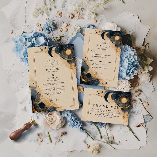A romantic celestial wedding collection inspired by midnight skies, golden constellations, and elegant night-garden details. Deep navy tones, soft ivory parchment, and delicate gold accents create a timeless, luxurious look perfect for evening ceremonies, formal celebrations, and modern classic aesthetics. Designed to feel refined, magical, and effortlessly sophisticated.