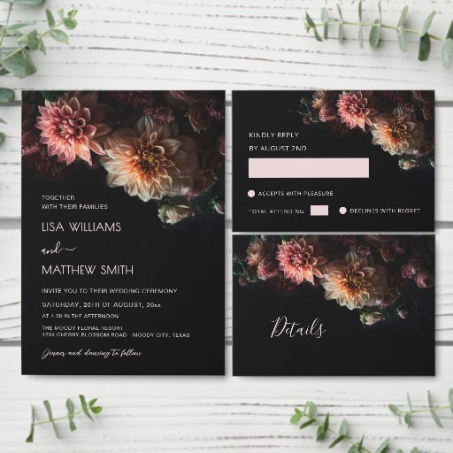 Dark moody romantic chrysanthemum menu card with bride and groom name and the wedding date on the backside.