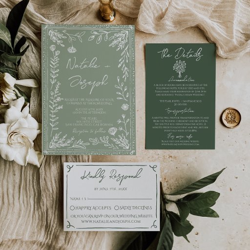 Dark Moss Green Whimsical Boho Modern Wedding 出欠カード