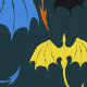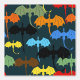 A striking tribal-style dragon wing group soaring upward across a deep, dark blue backdrop. Each dragon is uniquely illustrated in vivid black, brown, red, orange, yellow, blue, and green. Their bold, open wings and elegant tribal tattoo styling make this design a dynamic and mystical statement piece—perfect for fantasy lovers and dragon fans alike.