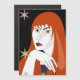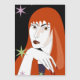 Beautiful girl with red hair on black night with colorful stars background