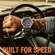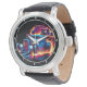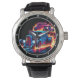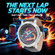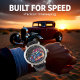 This dynamic watch face features two custom hot rod cars, one prominent in blue with orange flames, and another smaller, pink one in the background. Both vehicles are surrounded by vibrant, stylized flames and are set on a dark, reflective surface suggesting intense speed. The overall design is a powerful and bold celebration of classic car culture.
